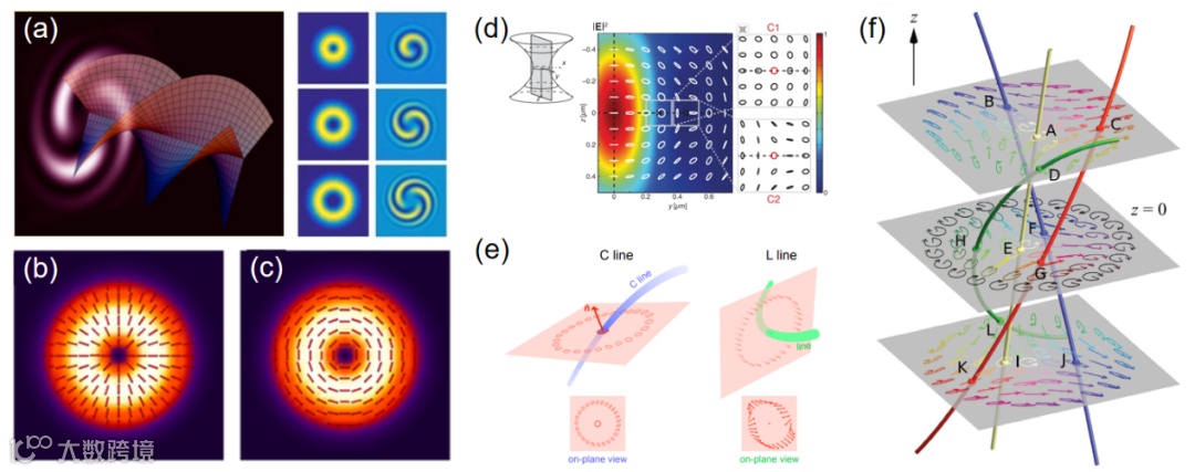 图1 光场中的拓扑现象。(a)存在相位型拓扑奇点的涡旋光束。(b)、(c)存在偏振型拓扑奇点的矢量偏振光场[Adv. Opt. Photon., 1, 1 (2009)]。(d)、(e)聚焦(非傍轴)光场中的C点、C线与L线等偏振拓扑现象[Phys. Rev. Lett., 117, 013601 (2016); Optica, 10, 1231 (2023)]。(f)合成偏振场中的霍普夫子(Hopfion)拓扑现象[Nat. Commun., 12:6785 (2021)]。