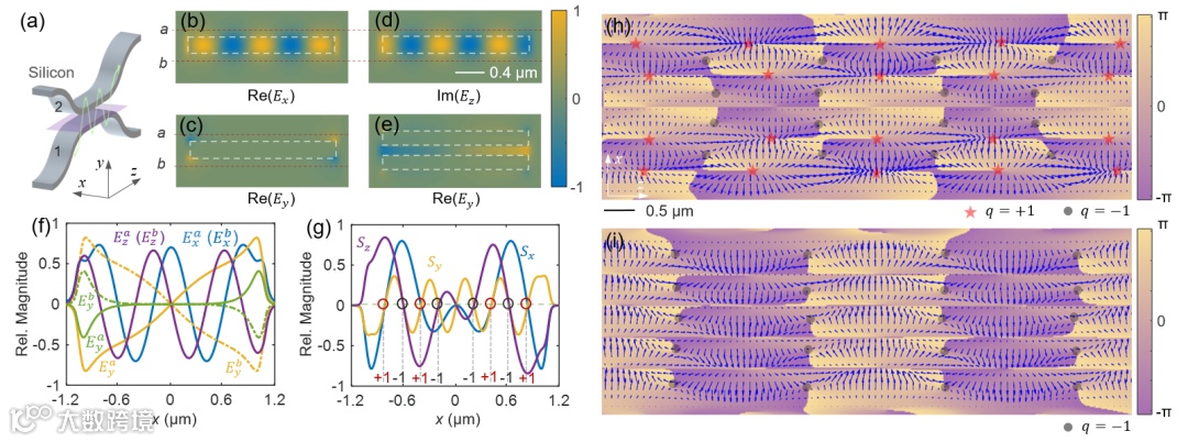图4 高阶横电模TE4倏逝场耦合产生的拓扑自旋阵列。(a)波导耦合系统示意图。 TE4模式的(b)Ex与(c)Ey分量实部场分布,以及(d)Ez的虚部场分布。(e) 奇对称的Ey分量被约束在狭缝中而使场分布增强。(f)各电场分量在线a和线b处的电场强度分布曲线。黄线显示Ey分量在狭缝处被显著增强。(g)耦合区域中央平面上三个自旋分量强度分布。(h)电场分量的自旋涡旋和反涡旋阵列及其自旋矢量方位角分布。 (i)磁场分量的反涡旋阵列及其自旋矢量方位角分布。蓝色箭头表示自旋矢量,红星与黑点分布标记拓扑荷为+1与-1的自旋奇点位置。