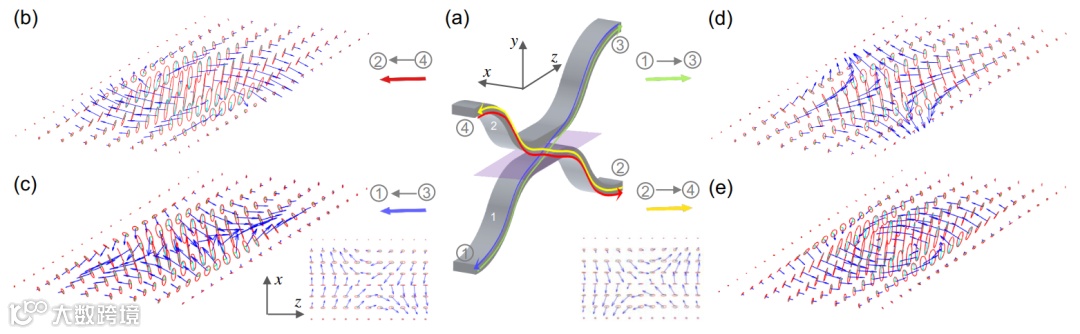 图3 定向耦合器不同端口输入条件下的偏振椭圆与拓扑自旋分布。(a)定向耦合器四端口输入及对应的耦合路径示意图。耦合路径从(b)4端口到2端口(红色)、(c)3端口到1端口(蓝色)、(d)1端口到3端口(绿色)以及(e)从端口2到端口4(黄色)时耦合区中央平面的三维偏振椭圆与自旋矢量分布。插图显示了投影到二维平面上的俯视图。(b)和(c)共享左插图,而(d)和(e)共享右插图。
