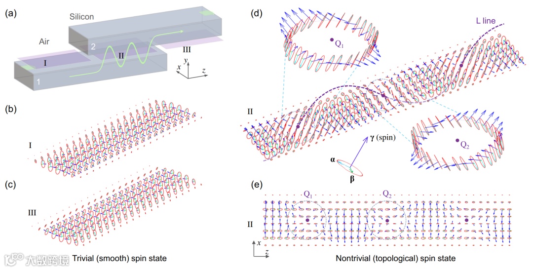 图2 波导倏逝场的平凡与非平凡自旋态。(a)条形硅波导倏逝场耦合示意图。(b)、(c)波导上表面(平面I)与下表面(平面III)形成的平凡(光滑)横向自旋分布。(d)波导倏逝场耦合区(平面II)形成的非平凡(拓扑)自旋态,表现出环绕偏振L线的自旋反涡旋分布。插图指示由半长轴(α,青色箭头)和半短轴(β,绿色箭头)矢量决定的偏振椭圆,以及与椭圆法向量(γ,蓝色箭头)方向一直的自旋矢量,三个矢量满足右手法则。(e)三维自旋矢量投影到耦合区中心平面上的俯视图。