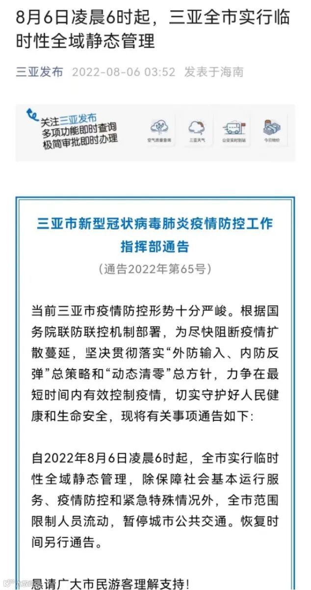“三亚发布”微信公众号8月6日凌晨发布消息称,8月6日凌晨6时起,全市实行临时性全域静态管理,除保障社会基本运行服务、疫情防控和紧急特殊情况外,全市范围限制人员流动,暂停城市公共交通。恢复时间另行通告。