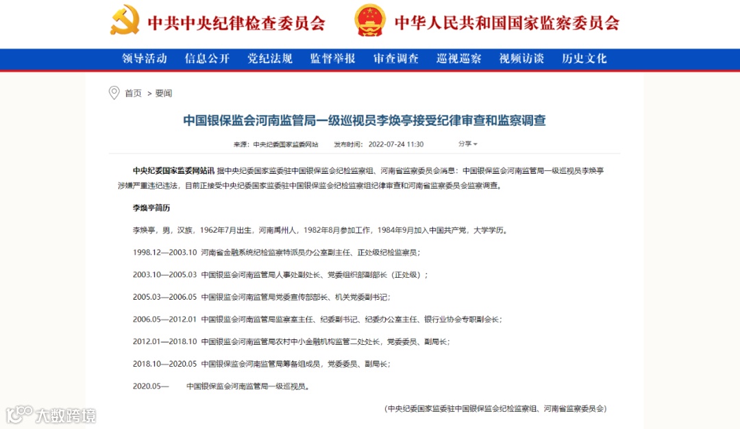 据中央纪委国家监委驻中国银保监会纪检监察组、河南省监察委员会7月24日消息,中国银保监会河南监管局一级巡视员李焕亭涉嫌严重违纪违法,目前正接受中央纪委国家监委驻中国银保监会纪检监察组纪律审查和河南省监察委员会监察调查。
