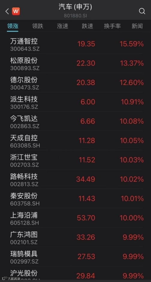 汽车产业链继续走强,其中中通客车股价再创历史新高,收报25.43元,涨5.3%,万通智控、松原股份、德尔股份、今飞凯达、秦安股份、瑞鹄模具、浙江世宝等十余股涨超10%或涨停。