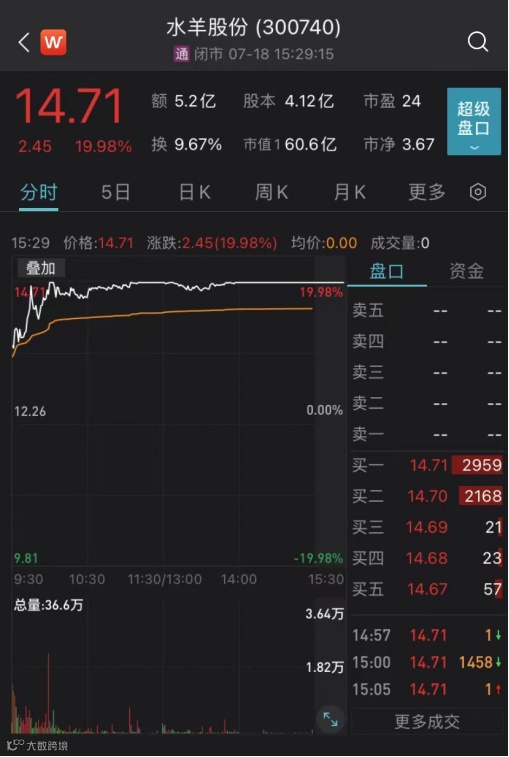 今日水羊股份20CM涨停,股价收报14.71元,创下3月中旬以来新高,成交额超5亿元,换手率超9%,最新总市值61亿元。