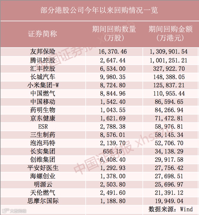 其中,今年以来回购金额超过1亿港元的公司数量为25家,超过10亿港元的有6家,友邦保险、腾讯控股的回购金额分别为130.99亿港元、100.13亿港元。