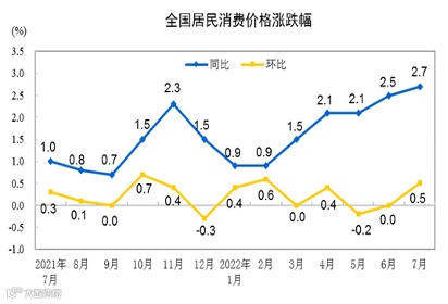 从环比看,7月份,CPI由上月持平转为上涨0.5%。从同比看,7月份,CPI上涨2.7%,涨幅比上月扩大0.2个百分点。