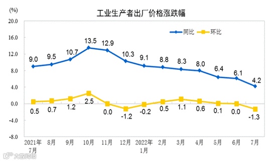 从环比看,7月份,PPI由上月持平转为下降1.3%。从同比看,7月份,PPI上涨4.2%,涨幅比上月回落1.9个百分点。
