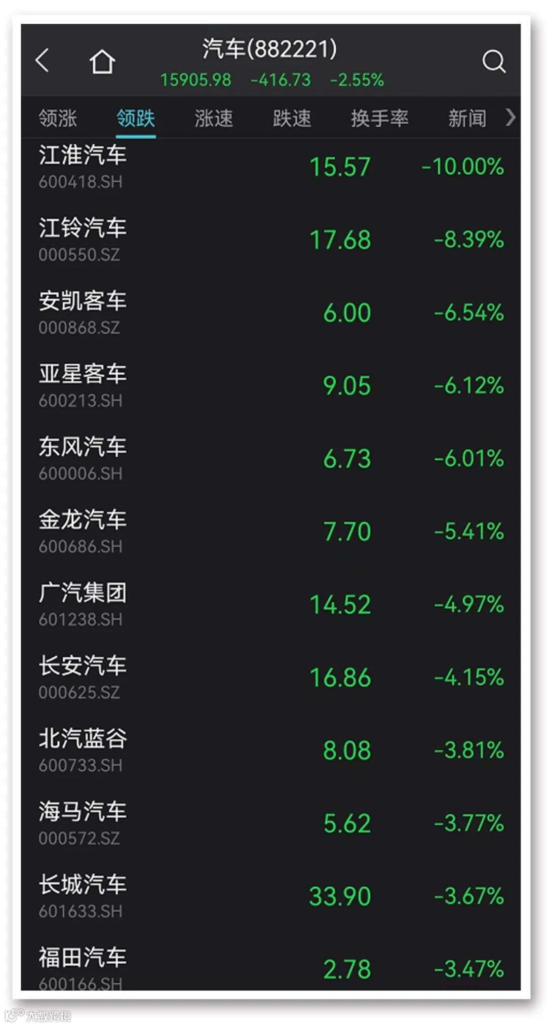 汽车产业链个股持续走低,江淮汽车跌停,江铃汽车跌逾8%,安凯客车、亚星客车、东风汽车跌超6%,广汽集团、长安汽车等跌幅也在4%以上。