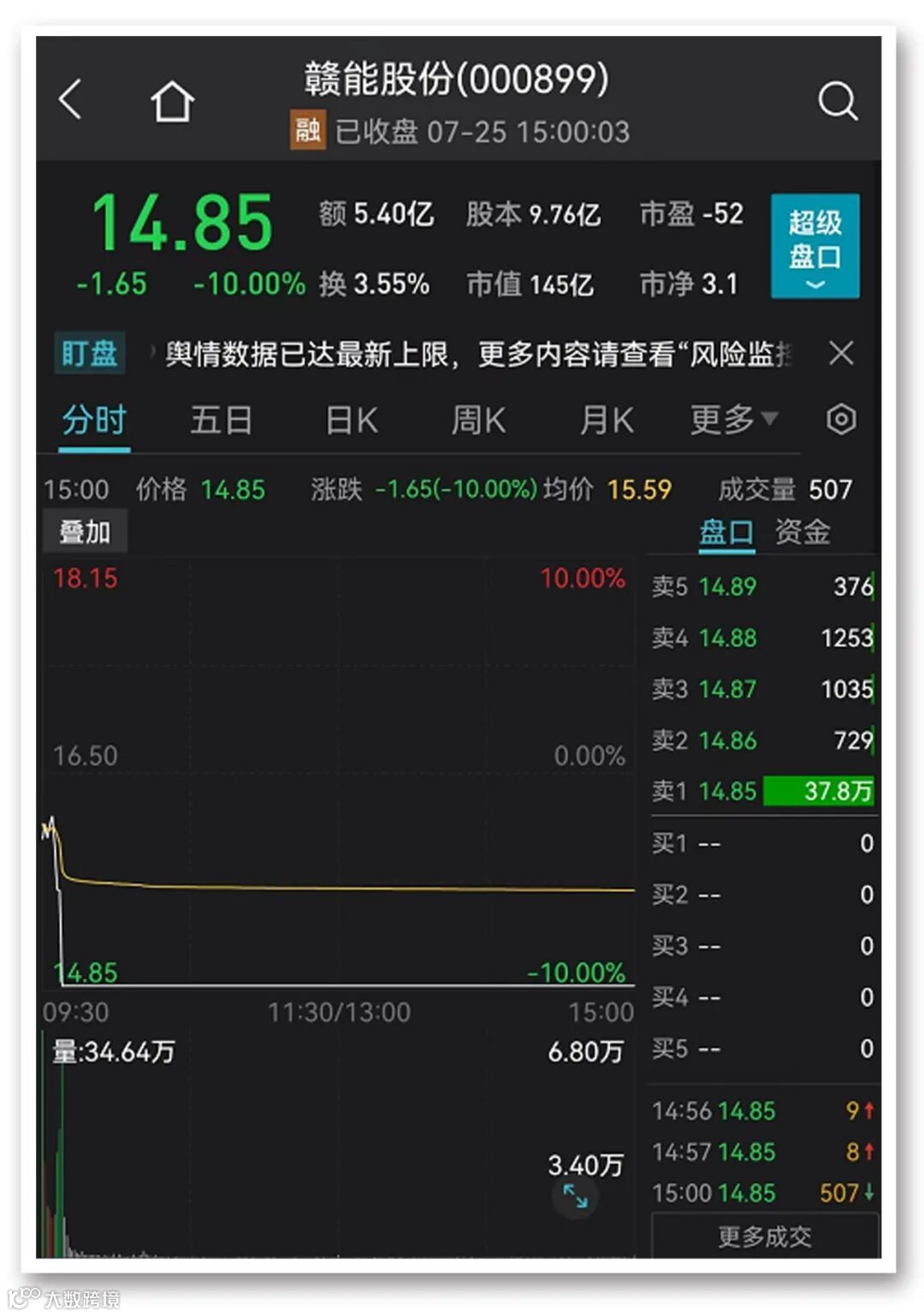 涉及绿色发电概念的赣能股份,今天开盘后突然跌停,最新报14.85元/股,市值145亿元。赣能股份在6月底至7月初曾连创9个涨停板,上周五盘中股价创出历史新高的17元/股。从今年4月底的低点4.24元/股至今,区间最大涨幅接近3倍。