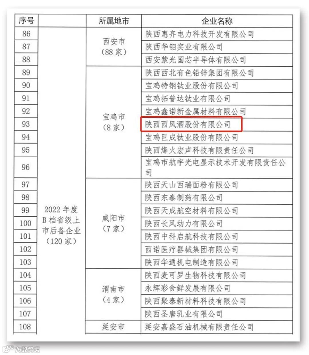 今年6月9日,陕西省推进企业上市工作领导小组办公室公布的2022年度省级上市后备企业名单中,西凤酒成功入选B档(B档企业以3家交易所联合推荐、已经与券商签约企业为主)。