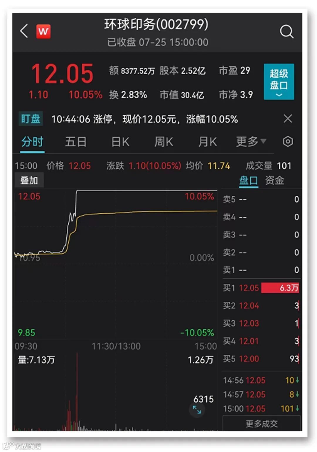 环球印务在早盘10:30前后突然大幅拉升,午盘前封住涨停板。截至收盘,其股价报12.05元/股,市值30.4亿元,涨停板上的封单超6万手。