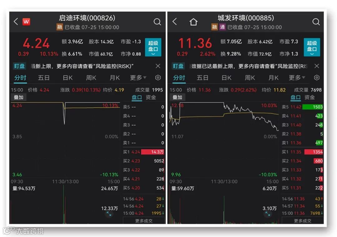 城发环境的走势却与之相反。早盘大幅拉升至涨停后,午后开盘便有巨量卖盘抛出,股价打开涨停。其股价收盘上涨2.62%,报11.36元/股,市值约73亿元。