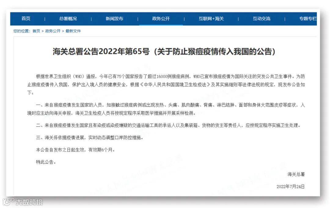据海关总署网站25日消息,根据世界卫生组织(WHO)通报,今年已有75个国家报告了超过16000例猴痘病例,WHO已宣布猴痘疫情为国际关注的突发公共卫生事件。为防止猴痘疫情传入我国,保护出入境人员的健康安全,根据《中华人民共和国国境卫生检疫法》及其实施细则等法律法规的规定,现发布公告如下: