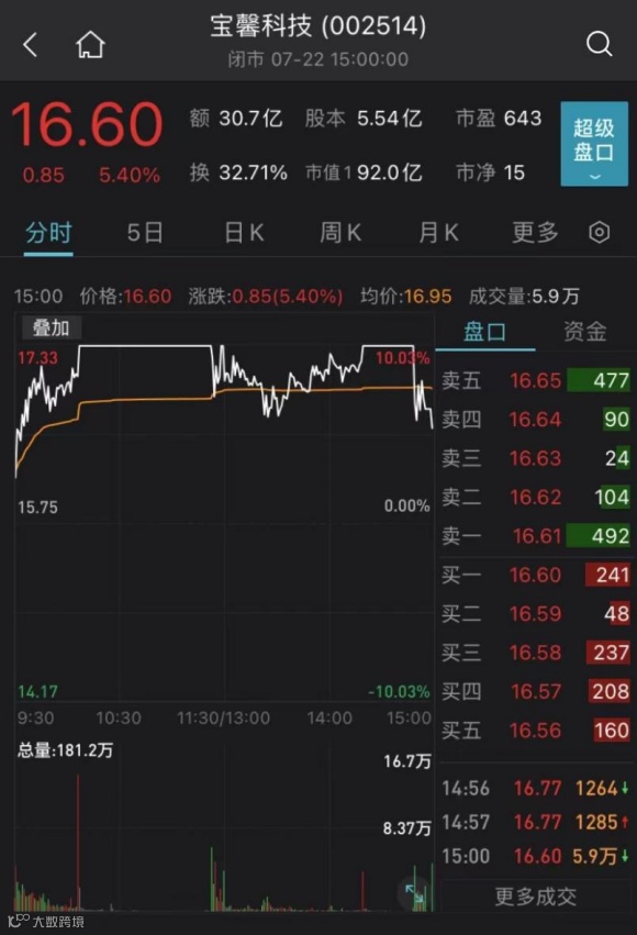 宝馨科技盘中触及涨停,报17.33元,尾盘打开涨停,收报16.6元,涨5.4%,最新总市值92亿元。该股自4月底低点至今累计涨幅超412%。