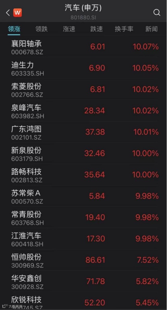 汽车概念股再度掀起涨停潮,襄阳轴承、迪生力、广东鸿图、东江环保、江淮汽车等多股涨停。