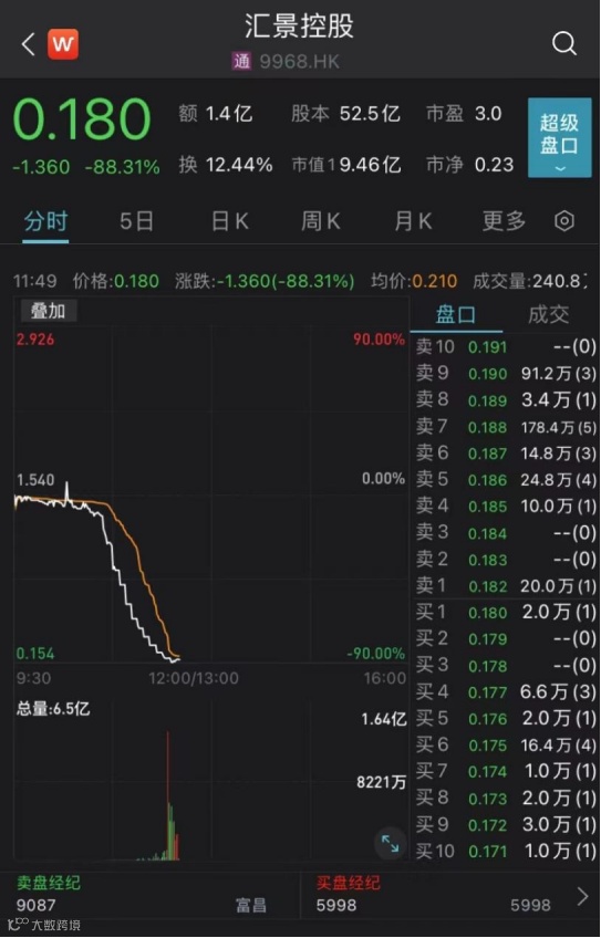 汇景控股持续下挫,跌幅扩大至88.31%,最新报0.18港元,总市值9.5亿港元,创历史新低。7月22日中午,港交所公告披露,汇景控股有限公司的股份已于当天午11点49分起短暂停止买卖。