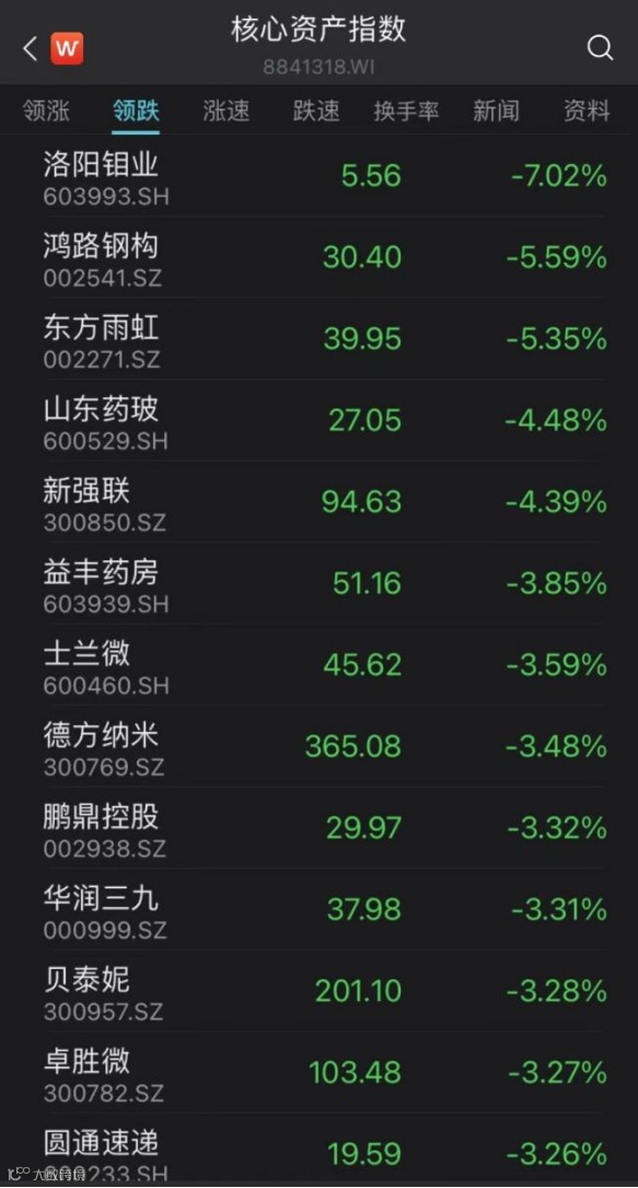 Wind核心资产指数震荡走低后,在尾盘大幅拉升,收盘跌0.57%。其中,昨日涨停的洛阳钼业跌超7%,“防水茅”东方雨虹、鸿路钢构均跌超5%,山东药玻、新强联跌超4%。