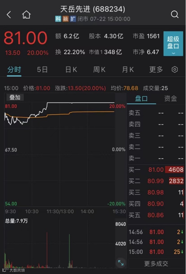天岳先进今日大幅高开,盘中强势拉升并封住涨停直至收盘,收报81元,创今年1月20日以来新高。从4月底低点至今,股价累计涨97.56%。