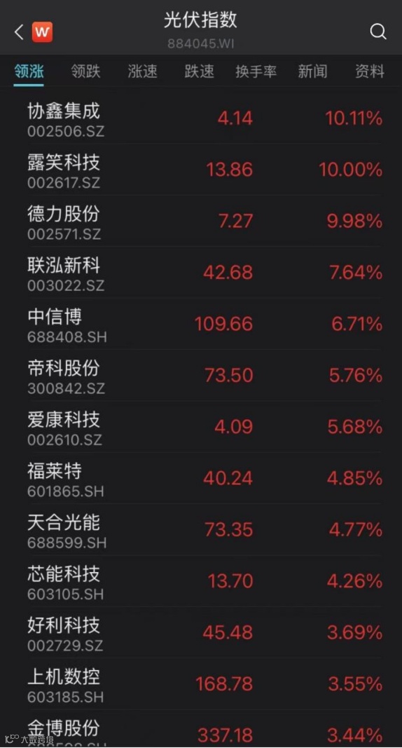 光伏方面,协鑫集成、露笑科技、德力股份涨停,天合光能涨4.77%,隆基绿能、TCL中环、晶澳科技、先导智能、锦浪科技等均涨超1%。