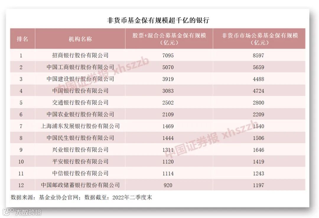此外,建设银行、中国银行、交通银行、农业银行、浦发银行、民生银行也跻身股混基金保有规模前十,股混基金保有规模超千亿的银行有11家。在非货币基金保有规模前十中,银行共占据6个席位,非货币基金保有规模超千亿的银行共有12家。
