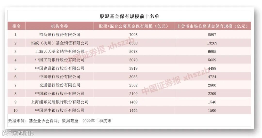 股票+混合公募基金保有规模方面,蚂蚁基金以6500亿元的规模仅次于招商银行位列第二,天天基金以5078亿元位列第三,分别较一季度末增长358亿元和439亿元。