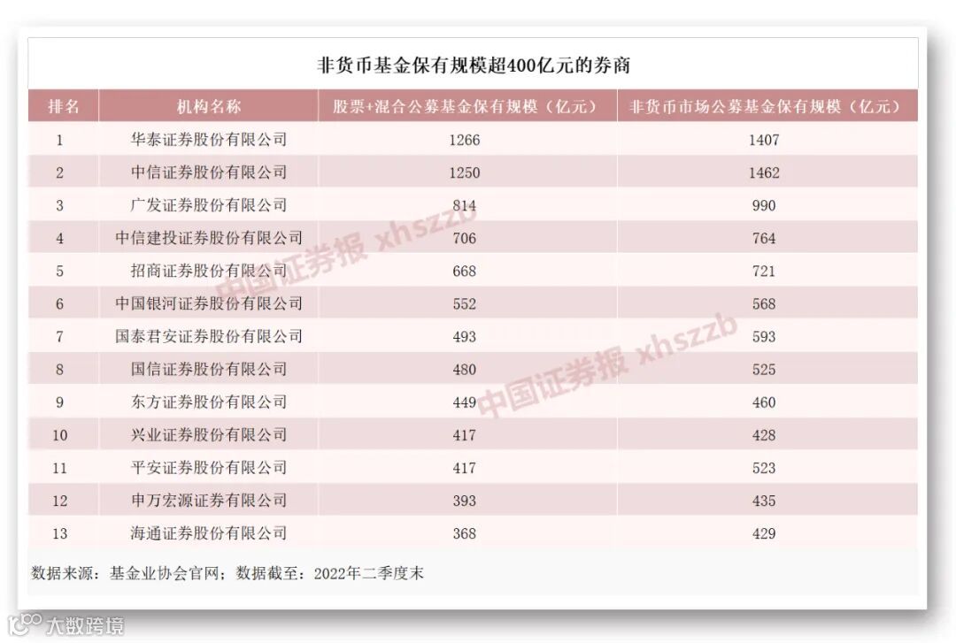 华泰证券发展势头迅猛。一季度末,华泰证券已位列券商股混基金保有规模第一,非货币基金保有规模与中信证券持平。而在2021年底,在券商代销江湖中,中信证券一家独大,是彼时46家进入榜单券商中唯一一家两类保有规模均超千亿元的券商。