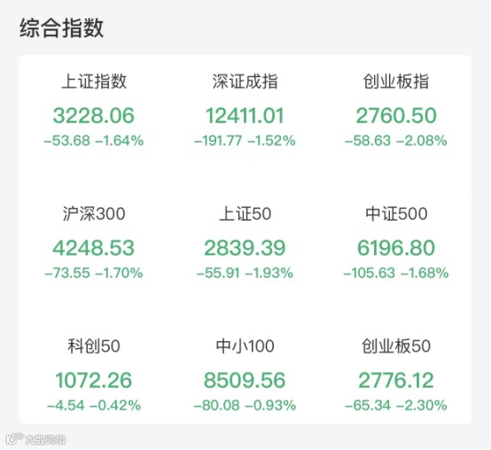 截至收盘,上证指数、深证成指、创业板指分别下跌1.64%、1.52%、2.08%。两市成交额达1.09万亿元,其中沪市成交额为4608.77亿元,深市成交额为6272.40亿元。