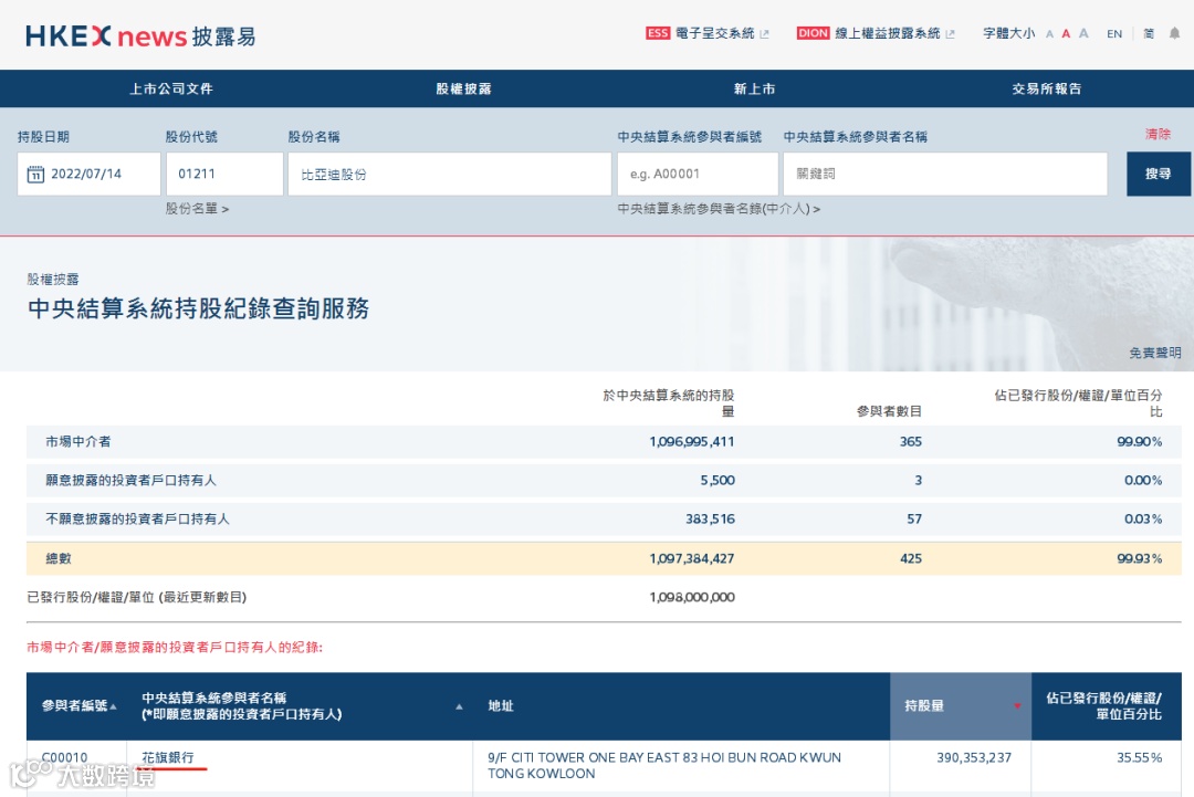 比亚迪H股的腾挪仍在继续。港交所披露数据显示,继7月11日花旗银行席位“离奇”突增约2.25亿股比亚迪H股后,截至7月14日,每一天该席位持有的比亚迪H股数量都在增加。7月11日持股量为388,609,416股,持股比例为35.39%;7月14日持股量为390,353,237股,持股比例为35.55%。3天时间里,持股量增加了1,743,821股,持股比例提升0.16个百分点。