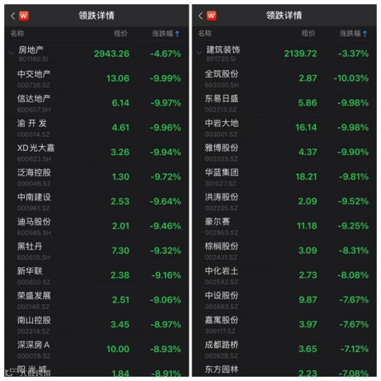 建筑装饰板块内,全筑股份、中岩大地、东易日盛、雅博股份跌停,华蓝集团、洪涛股份等跌逾9%。