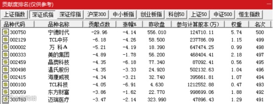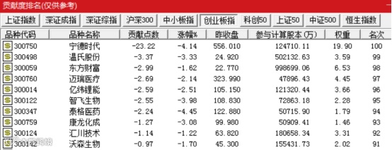 从对指数贡献度来看,大盘股下跌拖累指数。通达信数据显示,对上证指数贡献度居后的股票为长江电力、工商银行、三一重工,对深证成指贡献度居后的股票为宁德时代、TCL中环、万科A,对创业板指贡献度居后的股票为宁德时代、温氏股份、东方财富。其中宁德时代对创业板指的指数贡献点位达-23.22点,占今日创业板指下跌点数58.63点的近4成。
