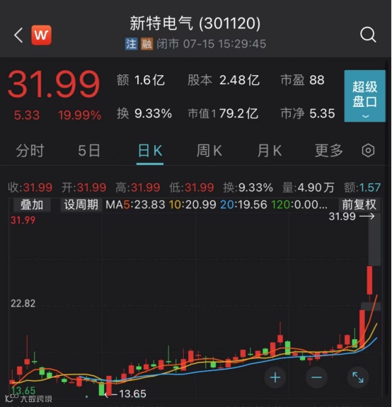 在今日个股多数下跌的情况下,此前连续2个交易日“20cm”涨停的新特电气今日“一字板”涨停,成功实现“20cm”涨停的“三连板”,近三个交易日累计上涨72.73%。