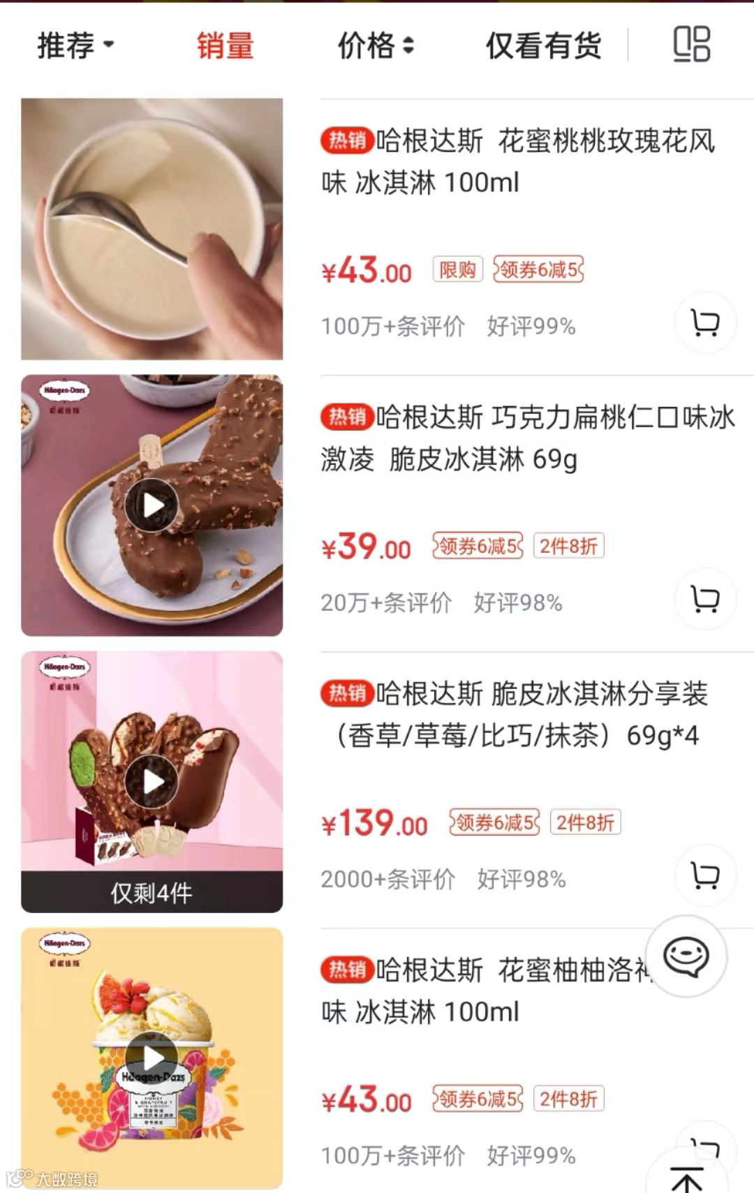 自哈根达斯进入中国,“高端”二字就成为其招牌。电商平台显示,哈根达斯100ml盒装冰淇淋售价43元左右,单只装的脆皮冰淇凌价格在39元以上。