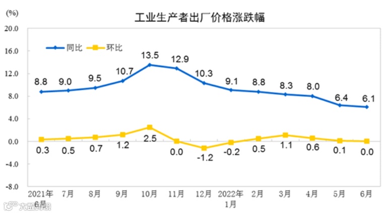 从同比看,6月PPI上涨6.1%,涨幅比上月回落0.3个百分点。