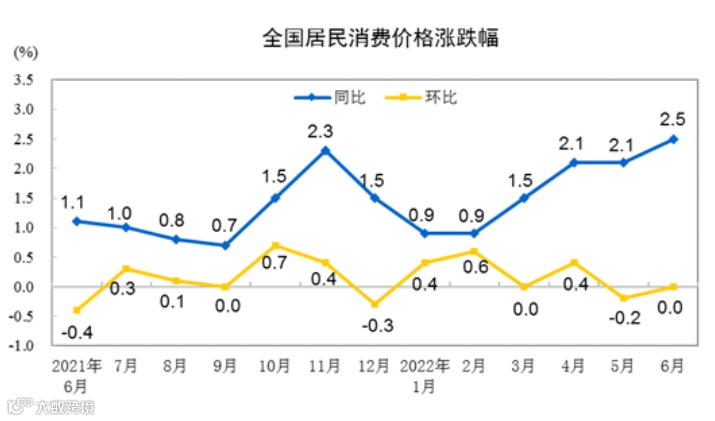 从同比看,6月CPI上涨2.5%,涨幅比上月扩大0.4个百分点。