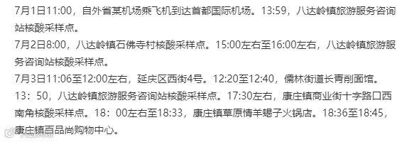 感染者1:通过社会面核酸筛查发现,现住延庆区长城脚下的公社(酒店)。6月15日回国,在京外完成14天集中隔离,7月1日乘坐MU5103航班返京,7月3日进行核酸检测,7月4日报告结果为阳性,当日诊断为确诊病例,临床分型为轻型。