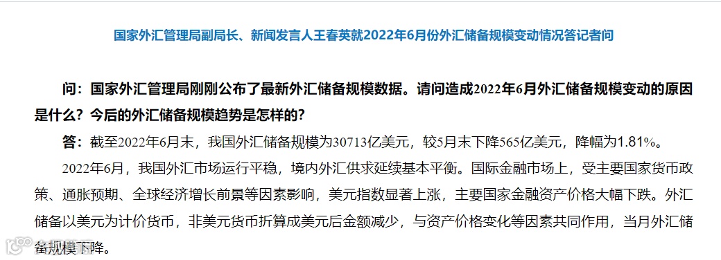 国家外汇管理局7月7日发布数据显示,截至2022年6月末,我国外汇储备规模为30713亿美元,较5月末下降565亿美元,降幅为1.81%。