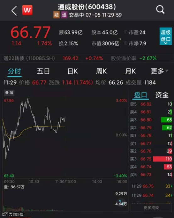 7月5日早盘,通威股份续创新高,总市值首次突破3000亿元。