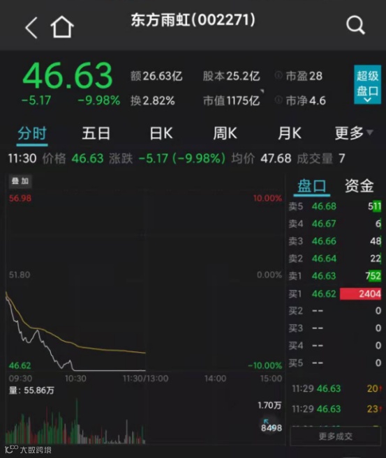 “防水茅”东方雨虹早盘跌停,最新市值1175亿元。