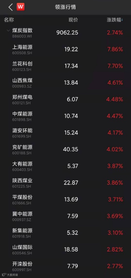 煤炭板块早盘大幅拉升,上海能源、兰花科创涨超5%,冀中能源、潞安环能、开滦股份、昊华能源、山西焦煤等跟涨。陕西煤业上涨3.86%,报22.87元/股,市值2217亿元,再创历史新高。