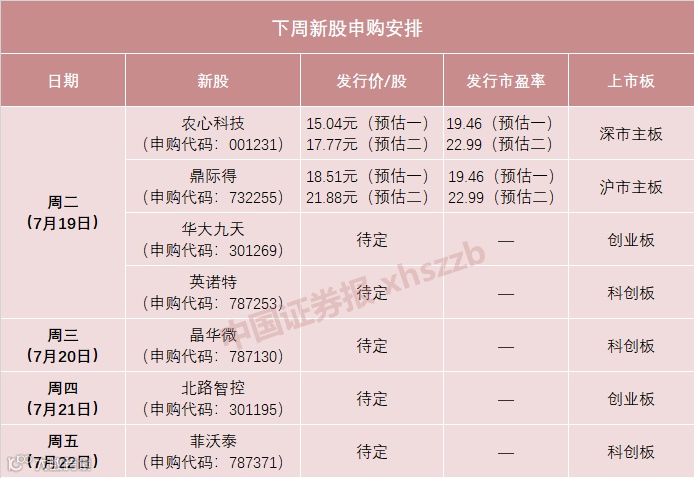 根据新股发行安排,下周有7只新股申购,包括科创板新股3只、创业板新股2只、沪市主板新股1只、深市主板新股1只。