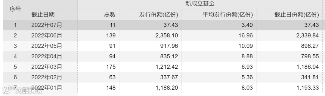 进入7月,随着股市赚钱效应的逐渐显现,权益基金发行热度提升。截至7月6日,7月有11只新基金成立,其中股票型、混合型和债券型基金发行份额分别为13.24亿份、10.97亿份和2.33亿份。7月5日晚间,易方达品质动能三年持有基金发布提前结束募集公告,该基金有效认购申请确认比例为81.42%,成为年内首只募资超百亿的主动权益基金。该基金成立后,将显著提高7月的权益基金发行总规模。
