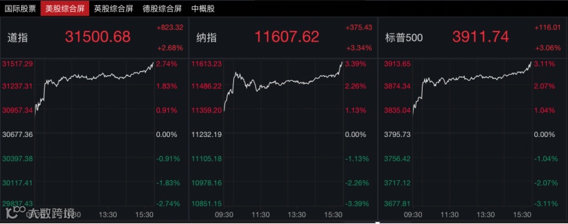 当地时间6月24日,美股三大指数全线收涨。据Wind数据,截至收盘,道指涨2.68%,标普500指数涨3.06%,纳指涨3.34%。