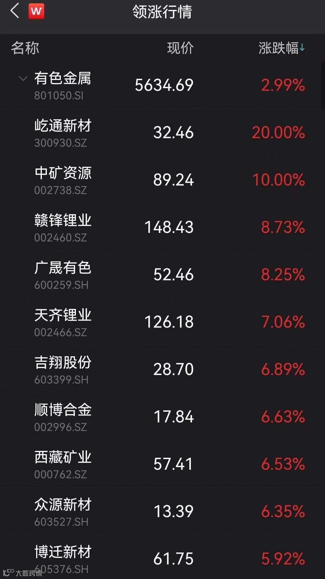 Wind数据显示,截至午间收盘,有色金属板块涨近3%,成分股中屹通新材收获“20CM”涨停,中矿资源早盘亦拉升封板,赣锋锂业、广晟有色、天齐锂业、吉翔股份、西藏矿业等个股跟涨。