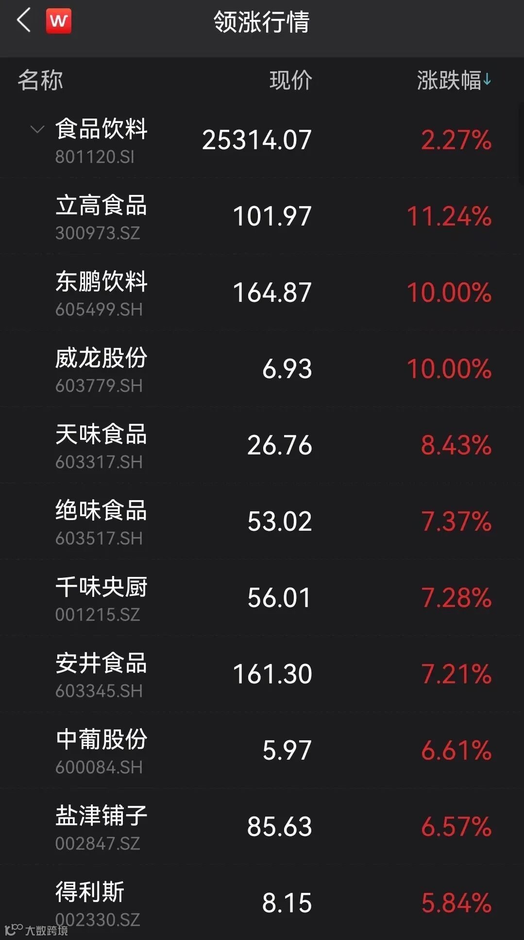 食品饮料板块今日早盘也有不错表现。Wind数据显示,截至午间收盘,成分股中立高食品涨逾11%,东鹏饮料、威龙股份双双涨停,绝味食品、天味食品、千味央厨、安井食品等多只个股半日涨逾7%,贵州茅台、五粮液、山西汾酒等多只白酒股盘中同创出阶段新高。