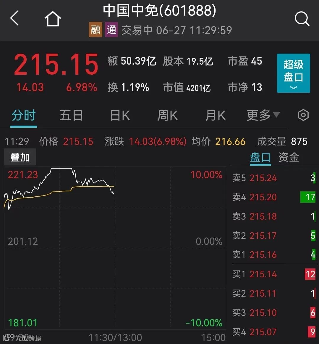 股价腰斩后的“免税茅”中国中免近期重拾涨势,今日早盘其股价跳空高开后一度拉升封板并创阶段新高。截至午间收盘,中国中免报215.15元/股,涨幅回落至6.98%。
