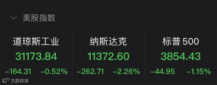 当地时间7月11日,美股三大股指集体下跌。标普500指数收跌44.95点,跌幅1.15%,报3854.43点。道琼斯工业平均指数收跌164.31点,跌幅0.52%,报31173.84点。纳斯达克综合指数收跌262.71点,跌幅2.26%,报11372.60点。