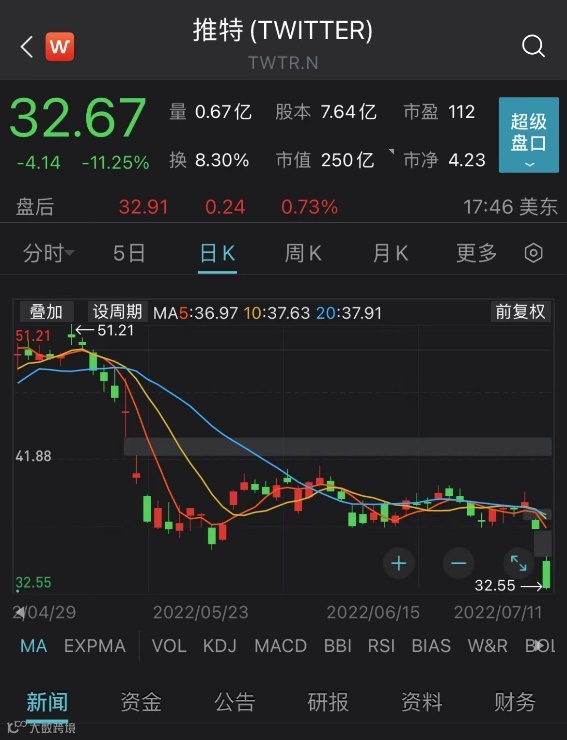 推特大跌11.25%,收报32.67美元/股。有分析师表示,如果马斯克以440亿美元收购推特的交易未能发生,后者股价可能会暴跌至11美元。