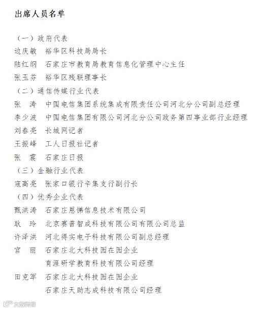 2021年6月25日,由石家庄北大科技园、石家庄恩悌信息技术有限公司联合主办的“高新技术企业发展研讨会”在石家庄北大科技园成功举行。裕华区科技局局长边庆敏、市教育局教育信息化管理中心主任陆红纲、裕华区残联理事长张玉芬、石家庄北大科技园副总经理关宏帅出席座谈。