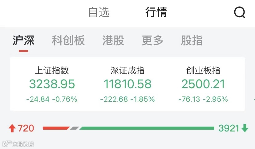 据中证金牛座数据,截至收盘,上证指数跌0.76%,报3238.95点;深证成指跌1.85%,报11810.58点;创业板指跌2.95%,报2500.21点。