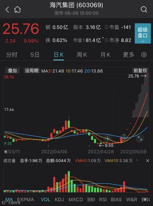 6月9日,海汽集团“一字”涨停,连收8个涨停板,该股最新报25.76元,股价创下2021年6月中旬以来新高,换手率0.62%,成交金额5042万元,最新A股总市值达81亿元。该股连续涨停期间,累计涨幅达114.31%。